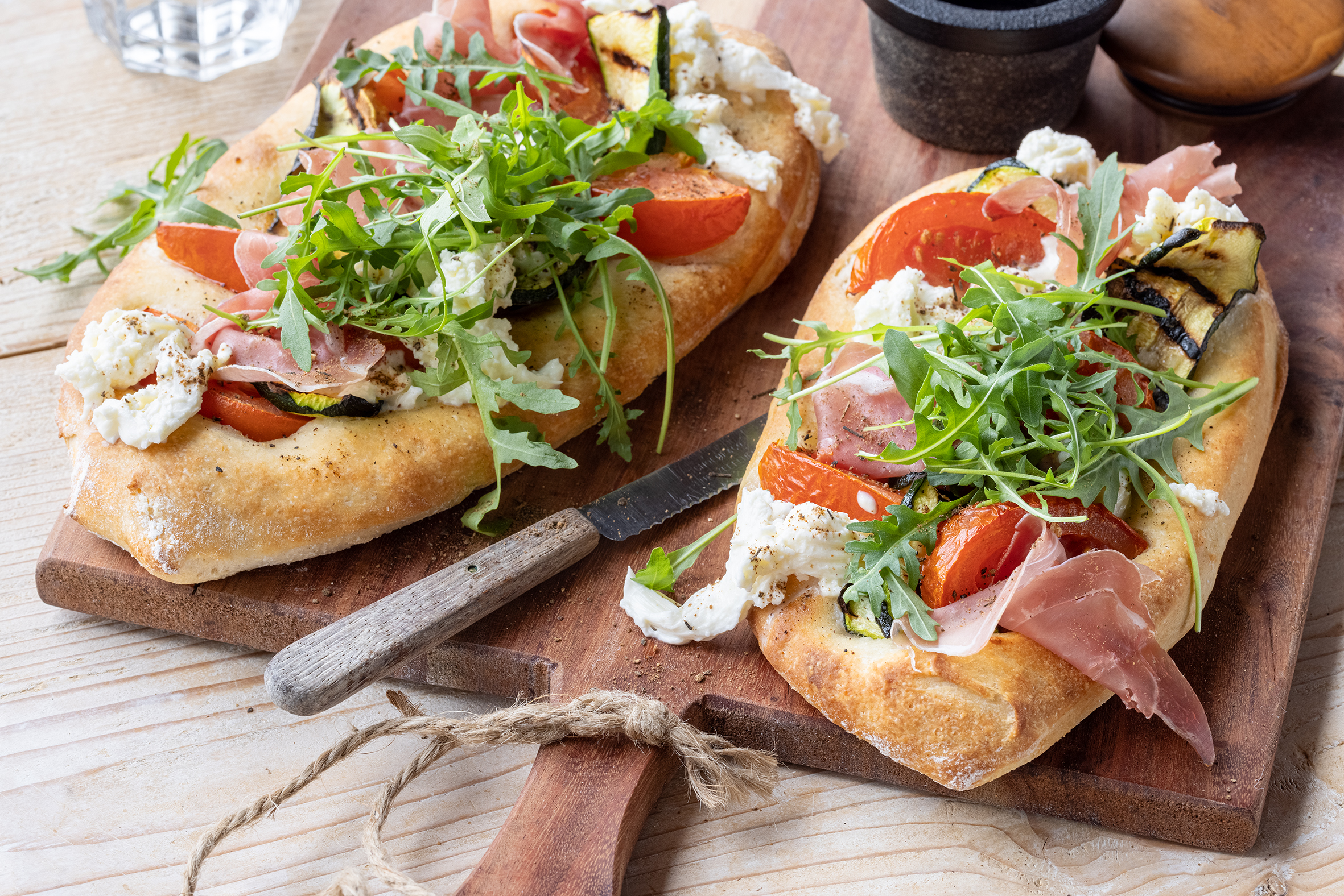 Bei uns sicherlich nicht so bekannt und beliebt wie das rote Original, aber ebenfalls einer DER Pizzaklassiker: die Pizza bianca. Die ist, grob gesagt, eine Pizza ohne Tomatensauce. Du ahnst es vielleicht – es gibt nicht DIE eine italienische Rezeptur, sondern auch hier viel Lokalpatriotismus: In und um Rom herum ist die Pizza bianca klassischer Streetfood, ein einfaches Fladenbrot mit Olivenöl, Knoblauch, Salz und Kräutern (Oregano, Rosmarin …). Man könnte sagen: eine dünne Focaccia. "Bianca" steht hier also eher für "blank". In den nördlichen Gefilden Italiens bezieht sich der Name eher auf die Zutaten, v. a. den Käse. Belegt ist die weisse Pizza mit einer weissen Sauce aus diversen Käsesorten wie Ricotta, Mozzarella, Parmesan, Frischkäse … Belegt wird sie mit weiteren Zutaten nach Belieben – z. B. Rucola, Gemüse oder Schinken.