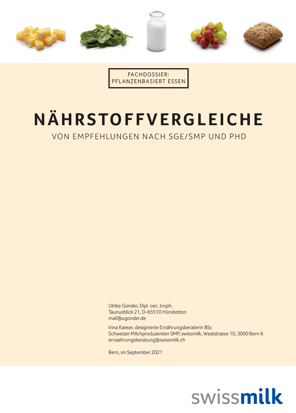 In diesem Fachdossier werden Nährstoffvergleiche zwischen einem Tagesbeispiel nach den Empfehlungen der Schweizer Milchproduzenten SMP und den Vorgaben der Planetary Health Diet angestellt. Das PHD-Tagesbeispiel wird dabei einmal mit 250 ml Milch/Milchprodukten und einmal ohne Milch berechnet.