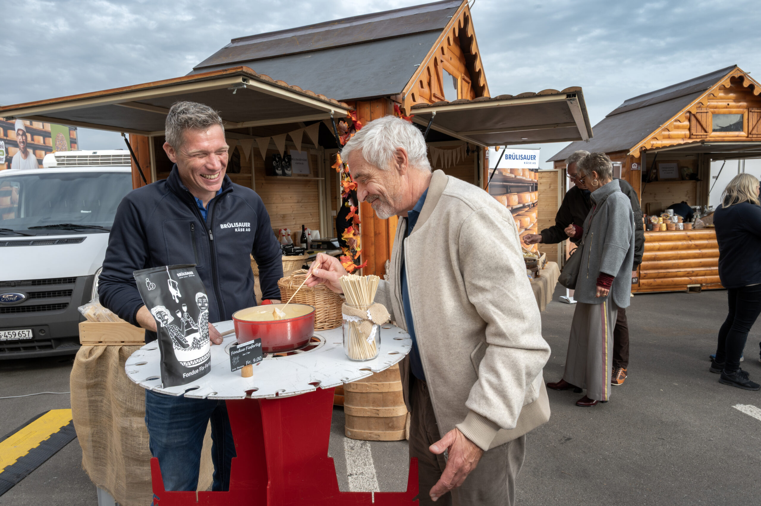 Obwohl wir in der Schweiz rund 23 Kilogramm Käse pro Jahr konsumieren, nimmt die Zahl der Käsereien ab. Im Kanton Aargau seien sie die zweitletzte traditionelle Käserei, versichert mir Fabian Spielhofer am Stand der Brülisauer Käse AG aus Künten. Das Fondue hat eine feine Säure und eine leichte Kirschnote, ist mild und doch geschmacklich interessant.