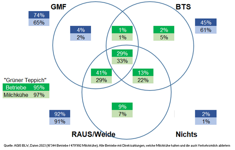 Aktuelle Zahlen zu diesen drei zentralen Programmen belegen, dass trotz des bereits hohen Ausgangsniveaus weiterhin Fortschritte erzielt werden. Ein Vergleich der Situation zum Zeitpunkt der Einführung des "Grünen Teppichs" im Jahre 2017 mit den aktuellsten Zahlen (2024) ergibt für die Milch-Betriebe und die Milchkühe bei den wichtigen Tierwohlprogrammen folgendes Bild (Erfüllungsgrad in %):