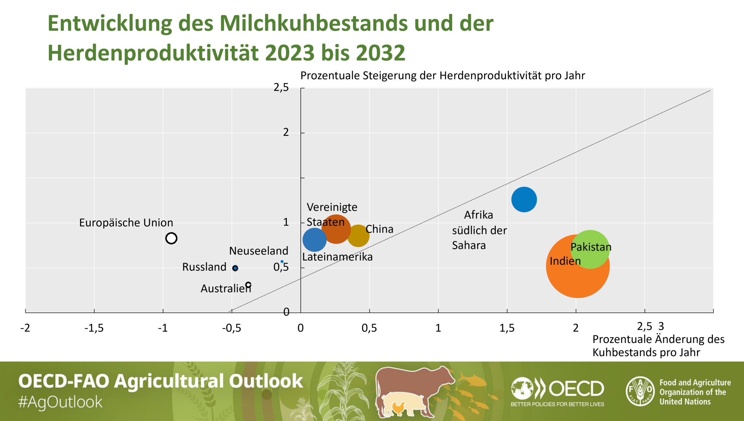 Laut FAO erreichen die Milchprodukte bis 2032 das stärkste globale Verbrauchswachstum (+1,5 % jährlich) aller Lebensmittel. Das Wachstum der Milchproduktion wird vor allem ausserhalb Europas und Ozeaniens realisiert. Der Kuhbestand wird vor allem in China, Pakistan und Afrika wachsen. Das von der FAO und der OECD vorgeschlagene Diagramm zeigt die zu erwartenden jährlichen Entwicklungen der Produktivitätssteigerung von Herden und die Bestandsveränderungen. Die Kreisfläche ist proportional zum absoluten jährlichen Wachstum der Milchproduktion zwischen 2020-2022 und 2032. Die weissen Kreise mit schwarzem Rand repräsentieren absolute Rückgänge.