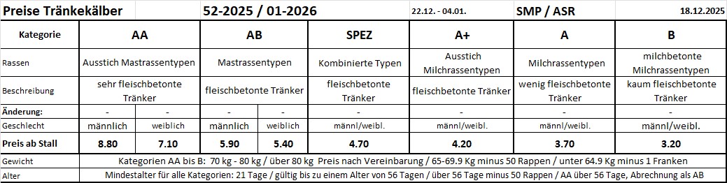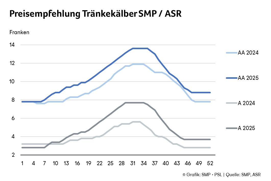 Seit 2020 publizieren die Geburtsbetriebe (Arbeitsgemeinschaft der Schweizer Rinderzüchter ASR und Schweizer Milchproduzenten SMP) eine Preisempfehlung für Tränkekälber. Die Milchproduzenten sollen eine möglichst genaue Angabe erhalten, welcher Preis für ein Tränkekalb erzielt werden kann.
