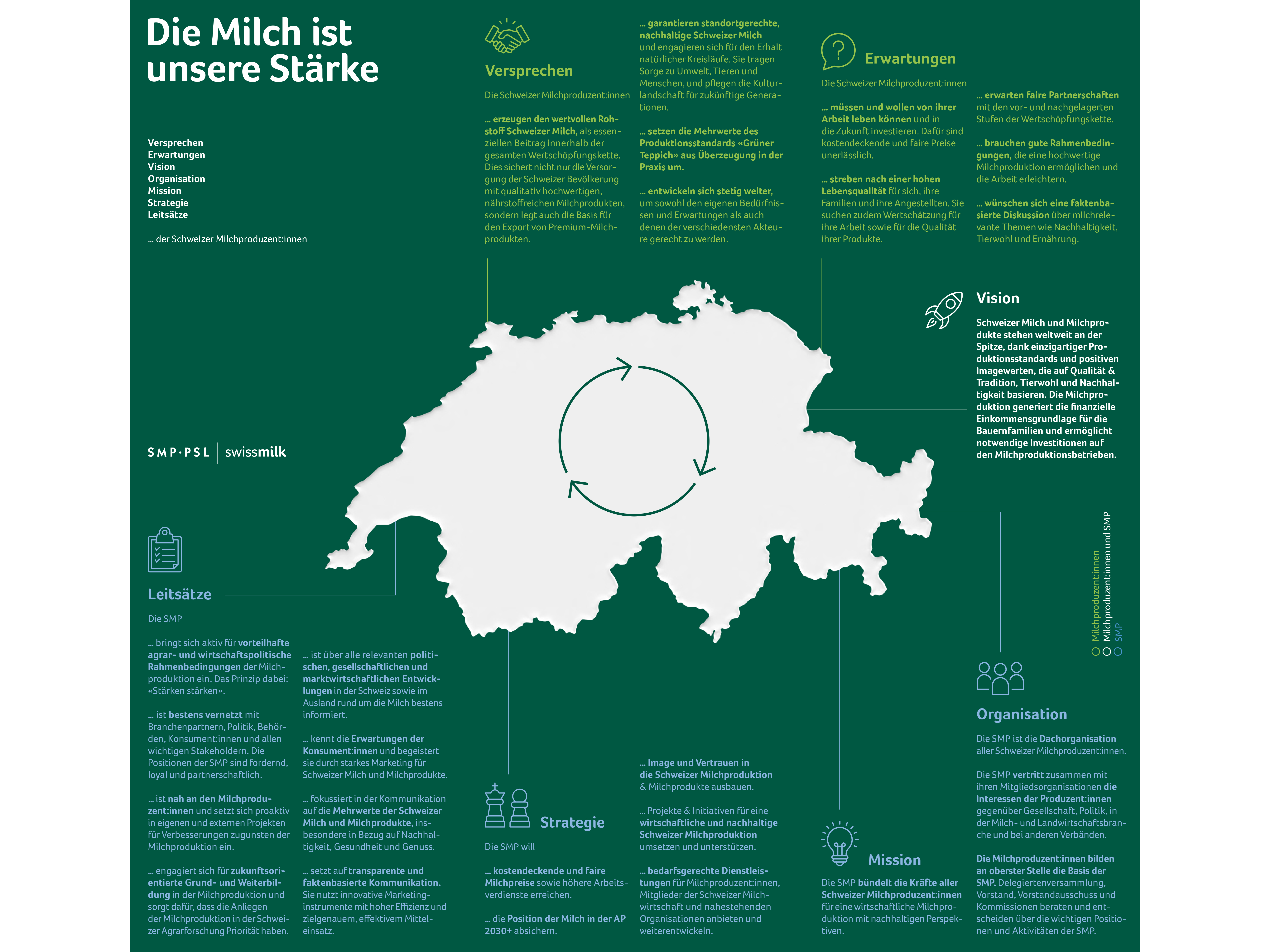 Die SMP vertritt die Interessen der Schweizer Milchproduzenten und ihrer lokalen und regionalen Organisationen auf gesellschafts- und wirtschaftspolitischer Ebene.