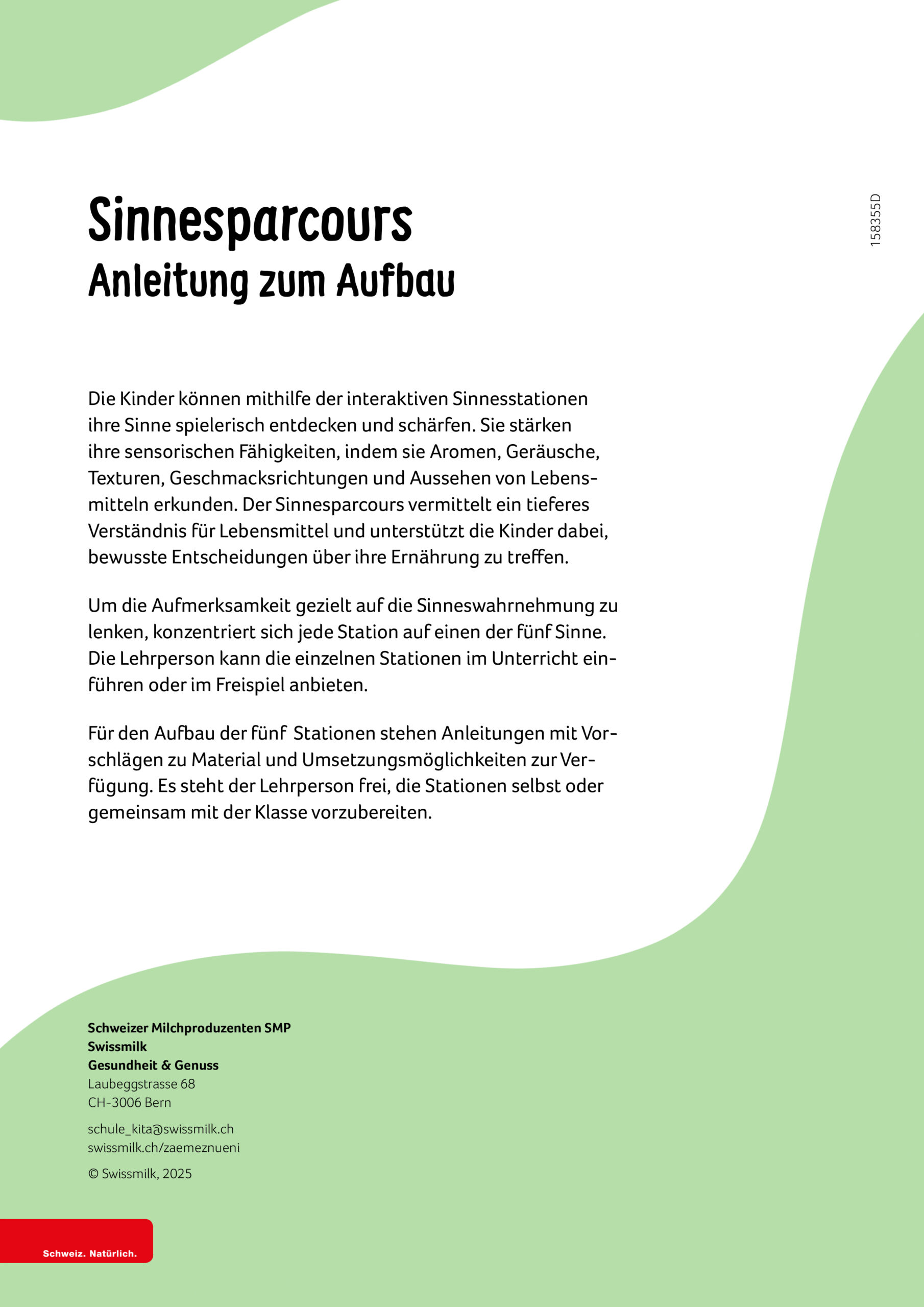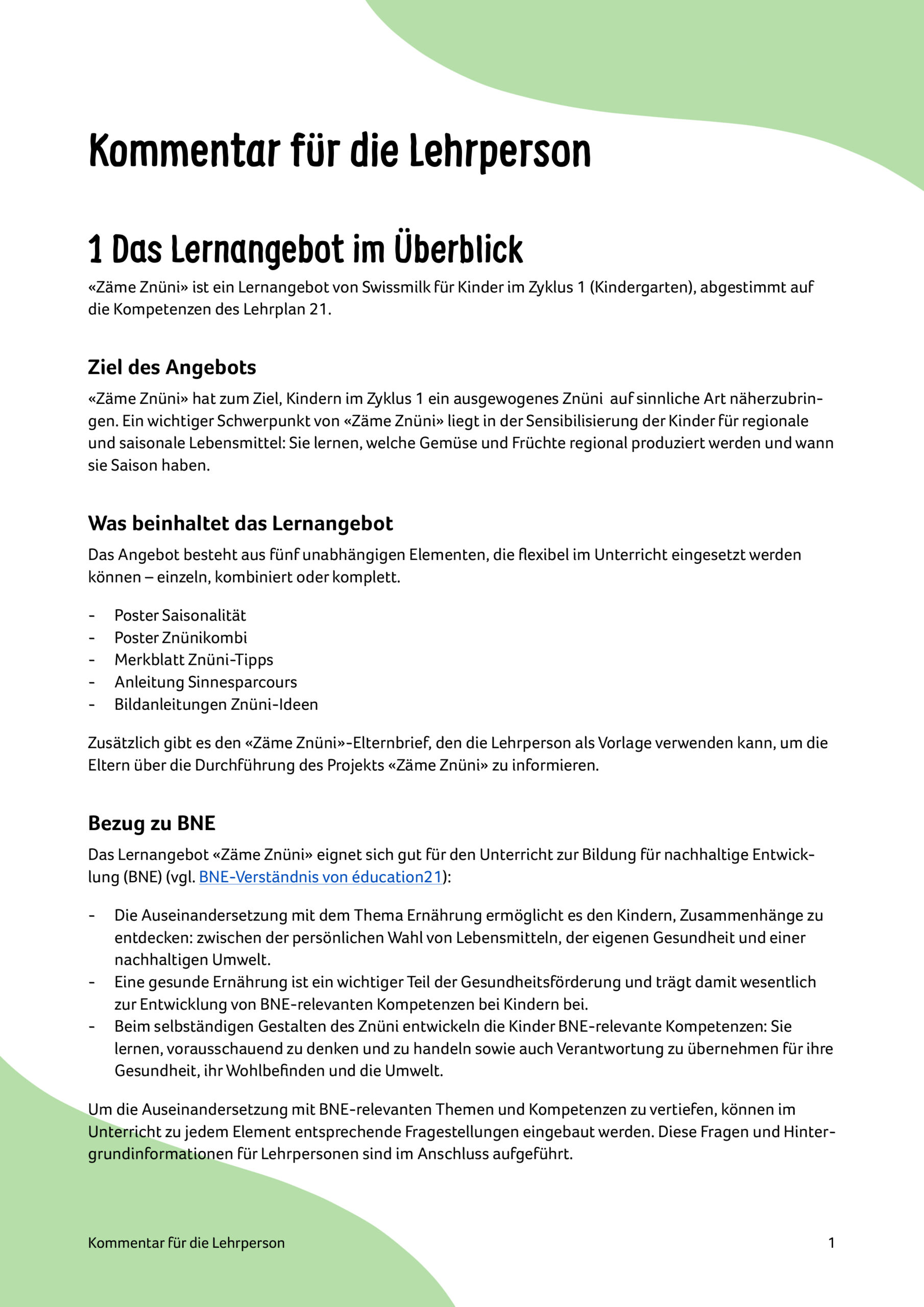Das komplette Angebot umfasst fünf Elemente: liebevoll gestaltete Bildanleitungen für kreative Znüni-Ideen, ein Poster zur Saisonalität, ein weiteres Poster zur ausgewogenen Znüni-Kombination, ein Merkblatt für Eltern sowie eine inspirierende Anleitung für einen erlebnisreichen Znüni-Sinnesparcours. Die Elemente lassen sich flexibel im Unterricht einsetzen – einzeln, kombiniert oder als Set. Ergänzend dazu stellen wir einen Lehrpersonenkommentar sowie eine Vorlage für einen Elternbrief zur Verfügung.