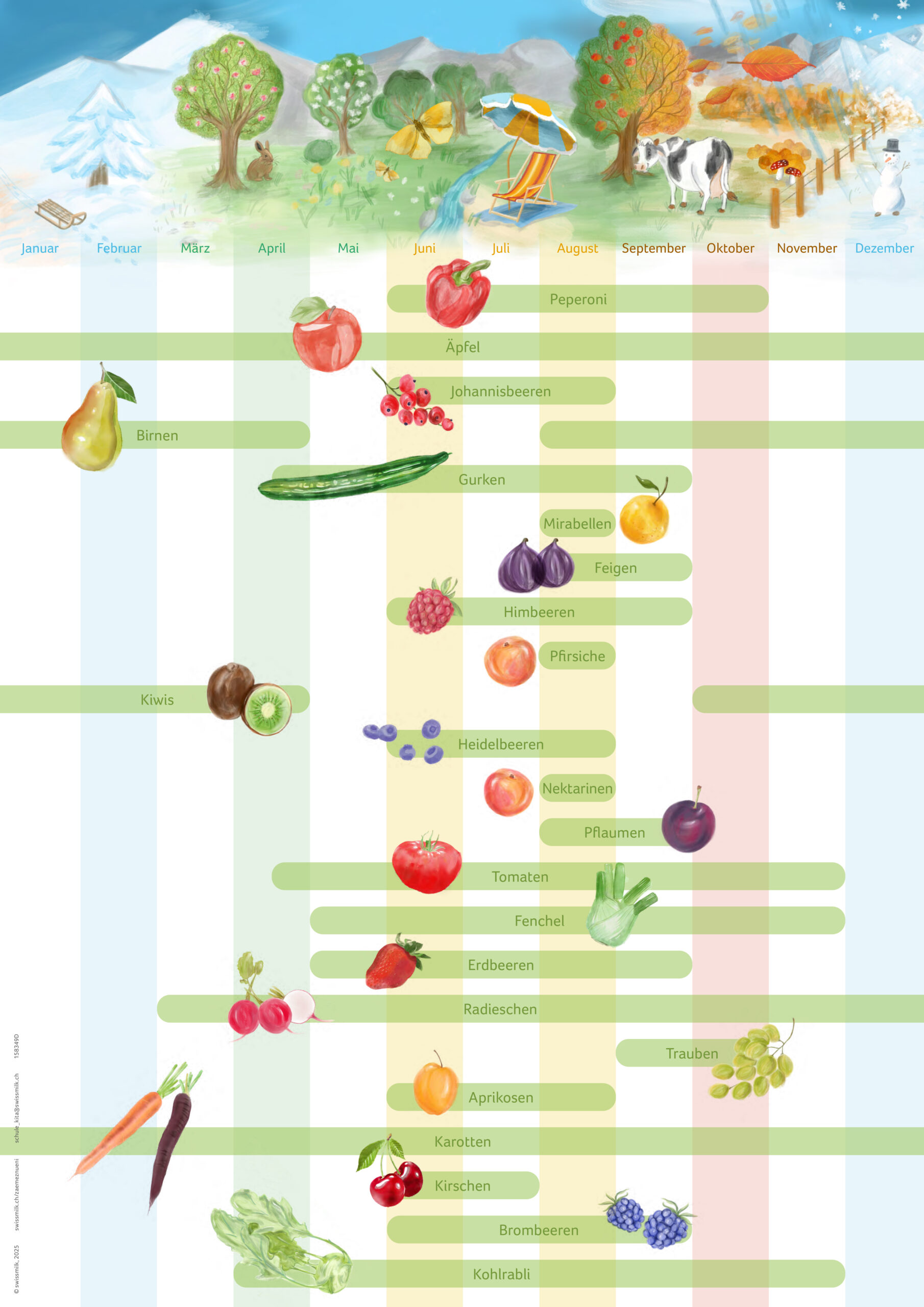 Das Poster «Saisonalität» bietet einen Saisonkalender mit Gemüse und Früchten, die sich als Znüni eignen und in der Schweiz geerntet werden können – kombiniert mit einer bildlichen Darstellung der Jahreszeiten. Das Poster «Znünikombi» zeigt, welche gesunden Lebensmittel in die Znüni-Box passen, und ergänzt das Poster «Saisonalität».