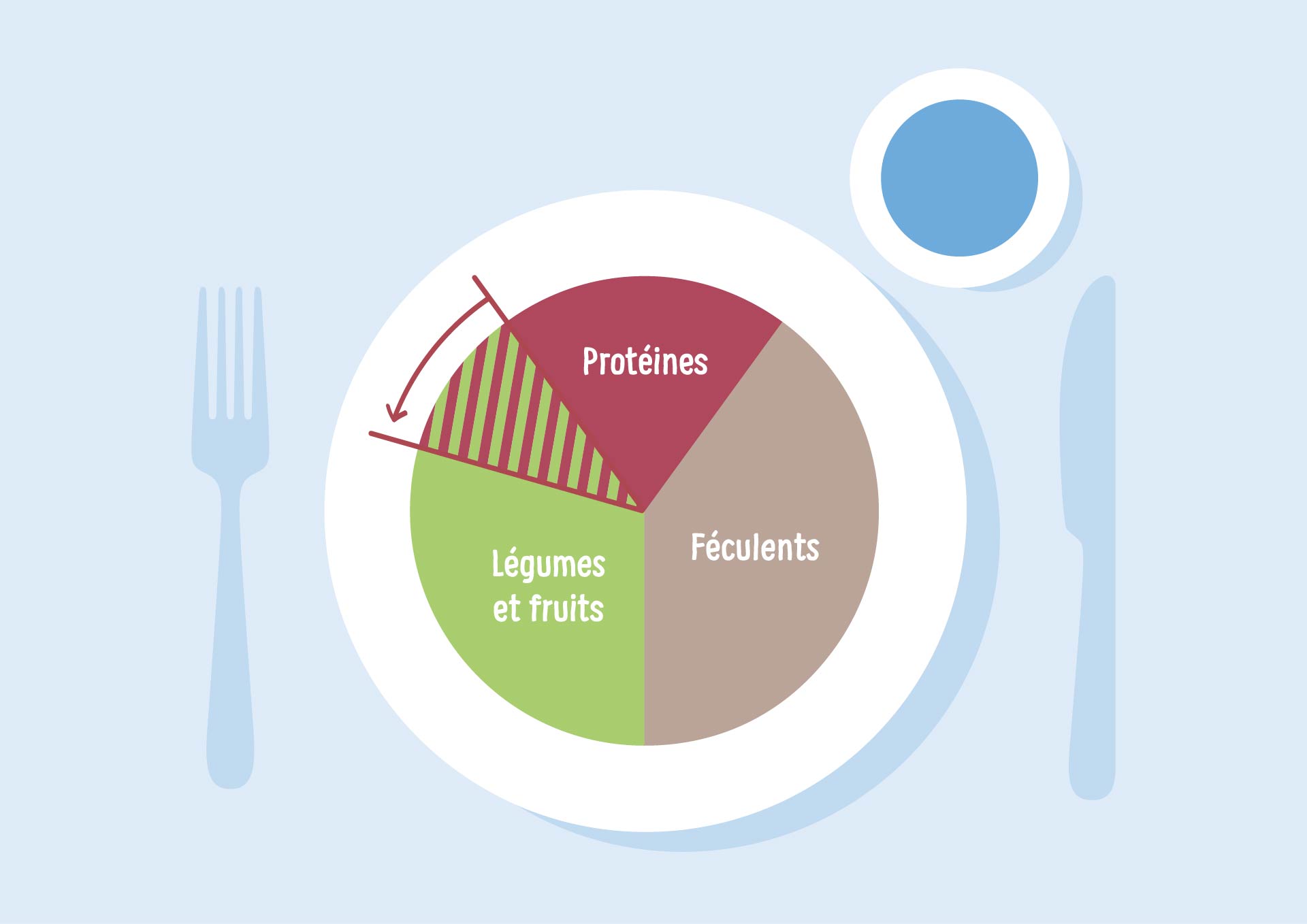 - Les fruits et légumes ne doivent occuper qu'environ ⅕ de l'assiette, car ils rassasient moins et remplissent l'estomac.