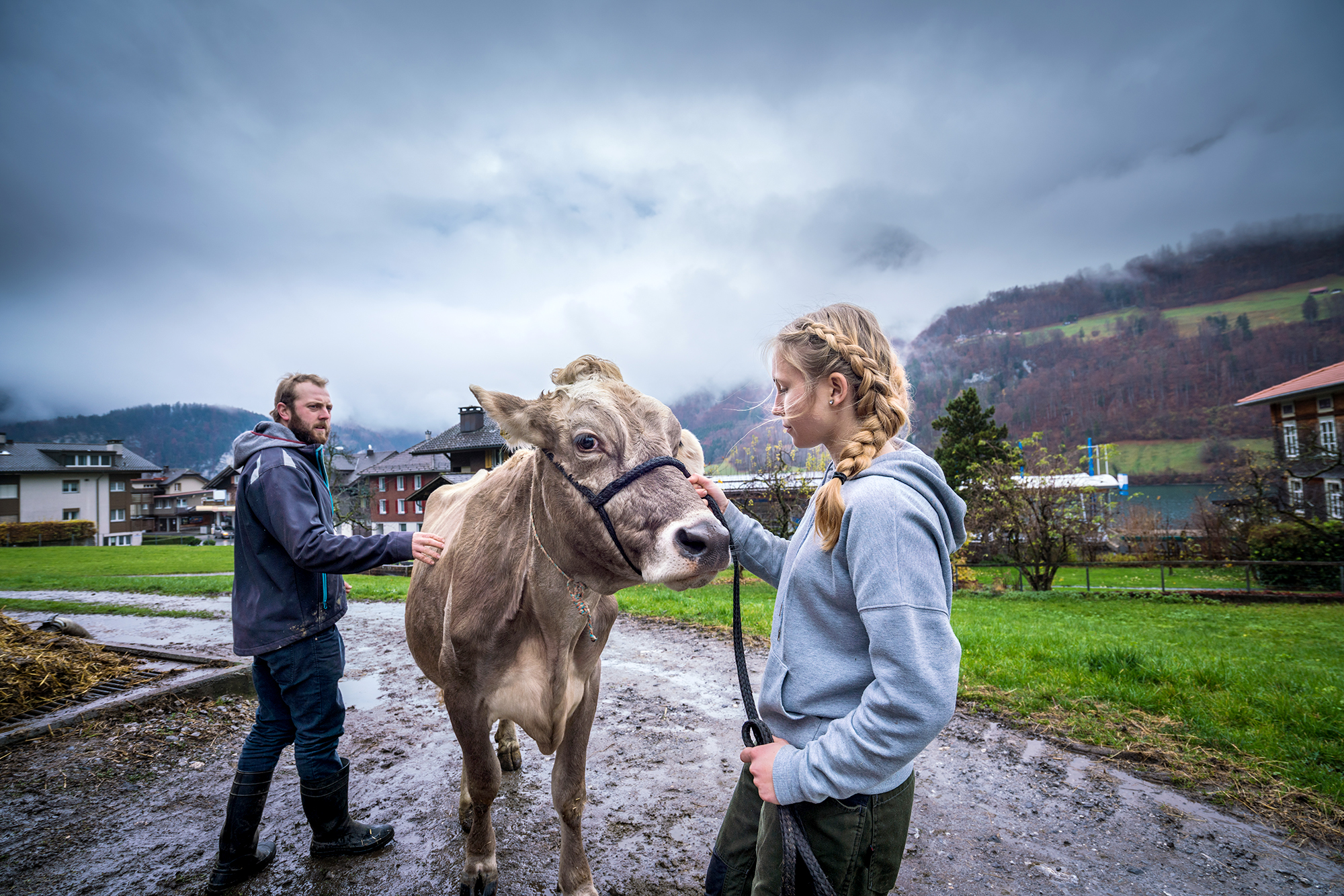 Chaque année, un millier de jeunes hommes et de jeunes femmes s'annoncent pour travailler à la ferme. Ils cherchent eux-mêmes les familles participantes par l'intermédiaire du site web d'Agriviva. Un portrait des familles, ainsi qu'une description de la ferme et des tâches leur permettent de se faire une idée. C'est ainsi que Lea a trouvé Marianne et Toni Hänni l'an passé. Quelque temps après, elle passait plusieurs jours chez eux, et l'expérience lui a tellement plu qu'elle a voulu revenir cette année. Mais il n'y a pas besoin de connaissances spéciales pour faire un stage à la ferme – le plus important, c'est d'être motivé et curieux. Il faut dire que les journées sont longues. Lea raconte qu'elle se lève à cinq heures. Elle commence par la traite.