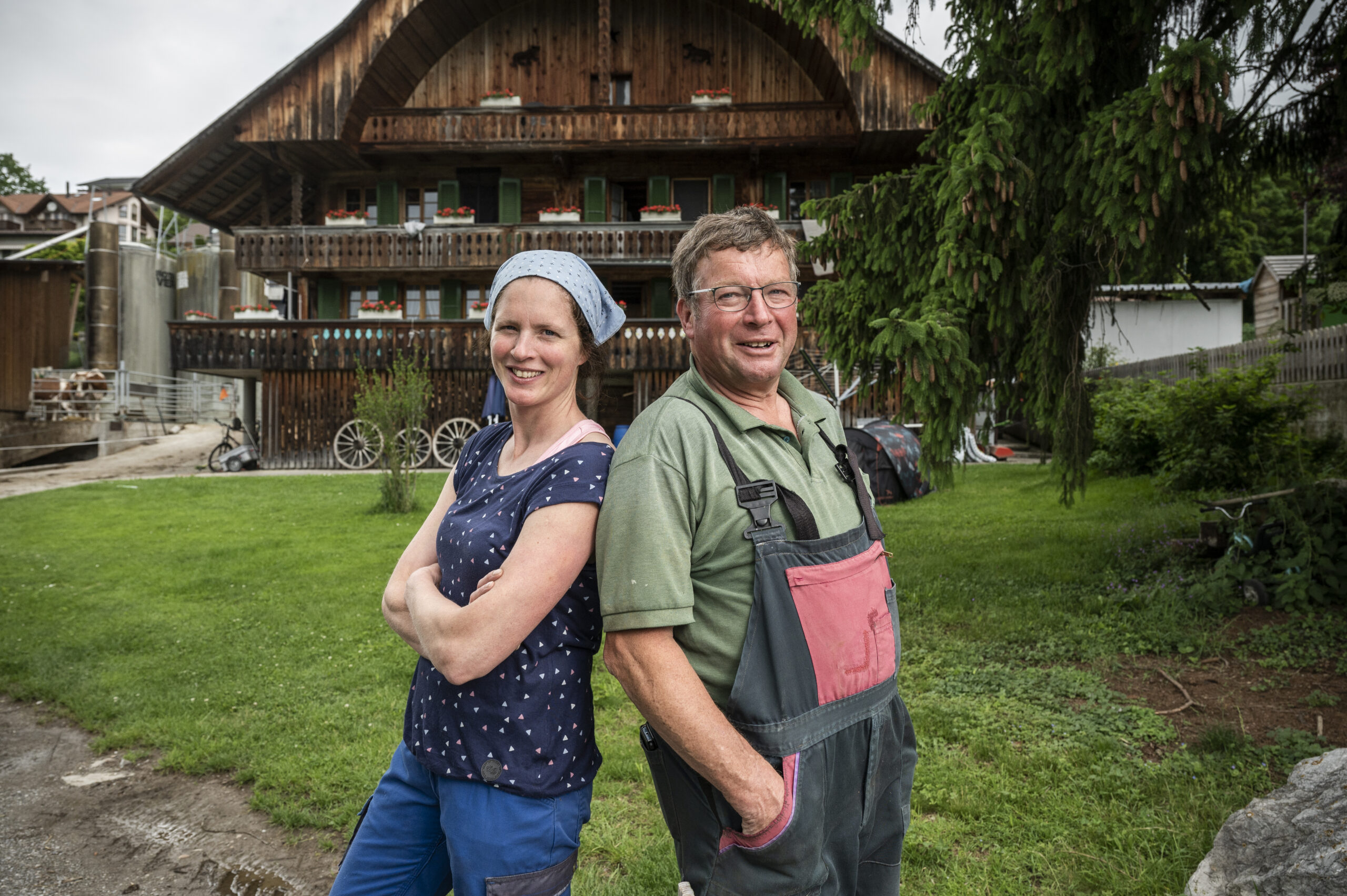 La majorité de ses vaches passent l'été un peu plus haut, sur les pâturages situés à deux kilomètres de la ferme. Christian Zeller s'y rend deux fois par jour pour la traite. Et même trois fois aujourd'hui pour me montrer les prés et les bêtes. Le troupeau compte surtout des Brunes originales. Mais entre toutes ces robes brun-argenté, on repère Leona et ses taches rouges: c'est la vache que les Zeller ont reçu comme cadeau de mariage. Et on aperçoit aussi Jim, un taureau puissant qui, malgré son jeune âge, inspire le respect.