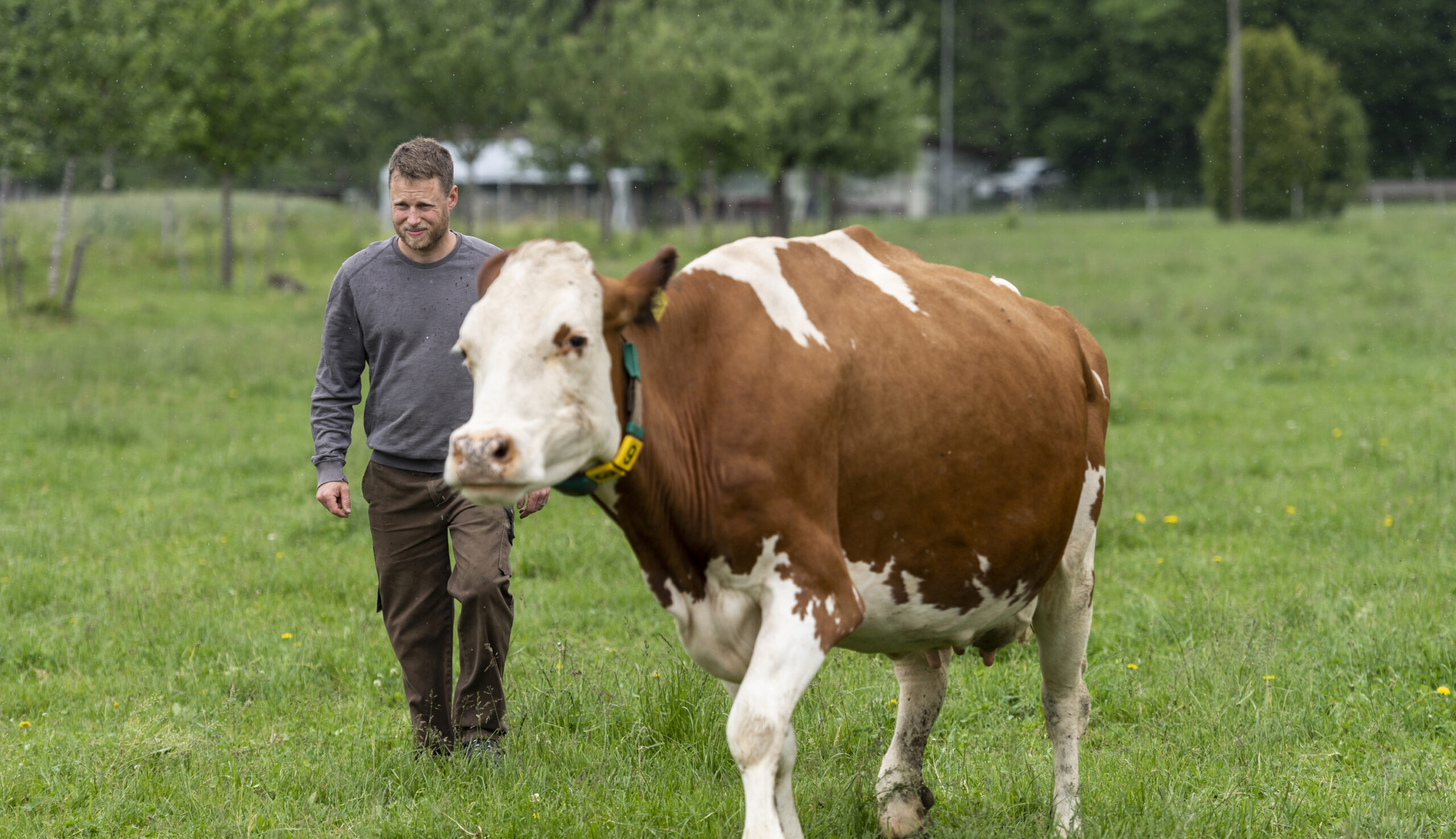 Même dans son troupeau de vaches laitières, Tobias opte pour des méthodes encore peu répandues. Depuis l'été dernier, il pratique l'élevage mère-veau: les veaux nouveau-nés ne sont pas séparés de la vache puis nourris au biberon, comme c'est le cas couramment. Ils sont allaités par leur mère. Tobias trait ensuite le lait restant. Depuis la révision, en mai 2020, de l'ordonnance réglant l'hygiène dans la production laitière, la vente de ce lait est autorisée.