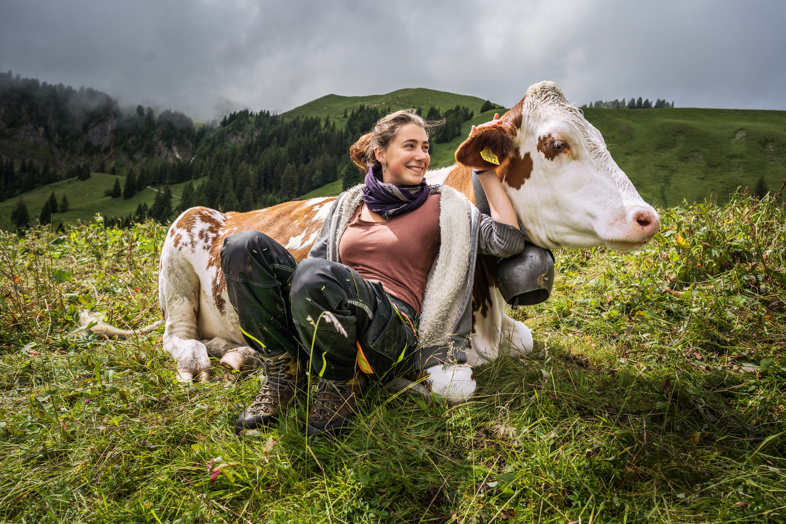 L'après-midi a été ensoleillé et légèrement venteux. Des conditions idéales: le foin récolté est sec. D'immenses filets sont déployés sur le sol. Armés de râteaux, les bénévoles rassemblent le foin et l'empilent sur les filets. Ils compressent les brins d'herbe puis attachent les quatre coins du filet au centre, formant un gigantesque ballot. Un tel filet avec son chargement pèse dans les 800 kilos, et peut même atteindre une tonne! Un hélicoptère descend les ballots dans la vallée, jusqu'à la grange de Roman Epp. Les faucheurs·euses produisent une quinzaine de balles de foin en une semaine sur cette pente. Roman Epp l'utilise comme fourrage d'hiver pour son jeune bétail. "Cela suffit pour nourrir mes sept à huit jeunes animaux durant deux mois et demi environ", dit-il. C'est un foin d'excellente qualité et très riche en nutriments, car il contient une multitude d'herbes sauvages. "Il est si parfumé qu'on pourrait en faire du thé", ajoute Roman Epp en rigolant.