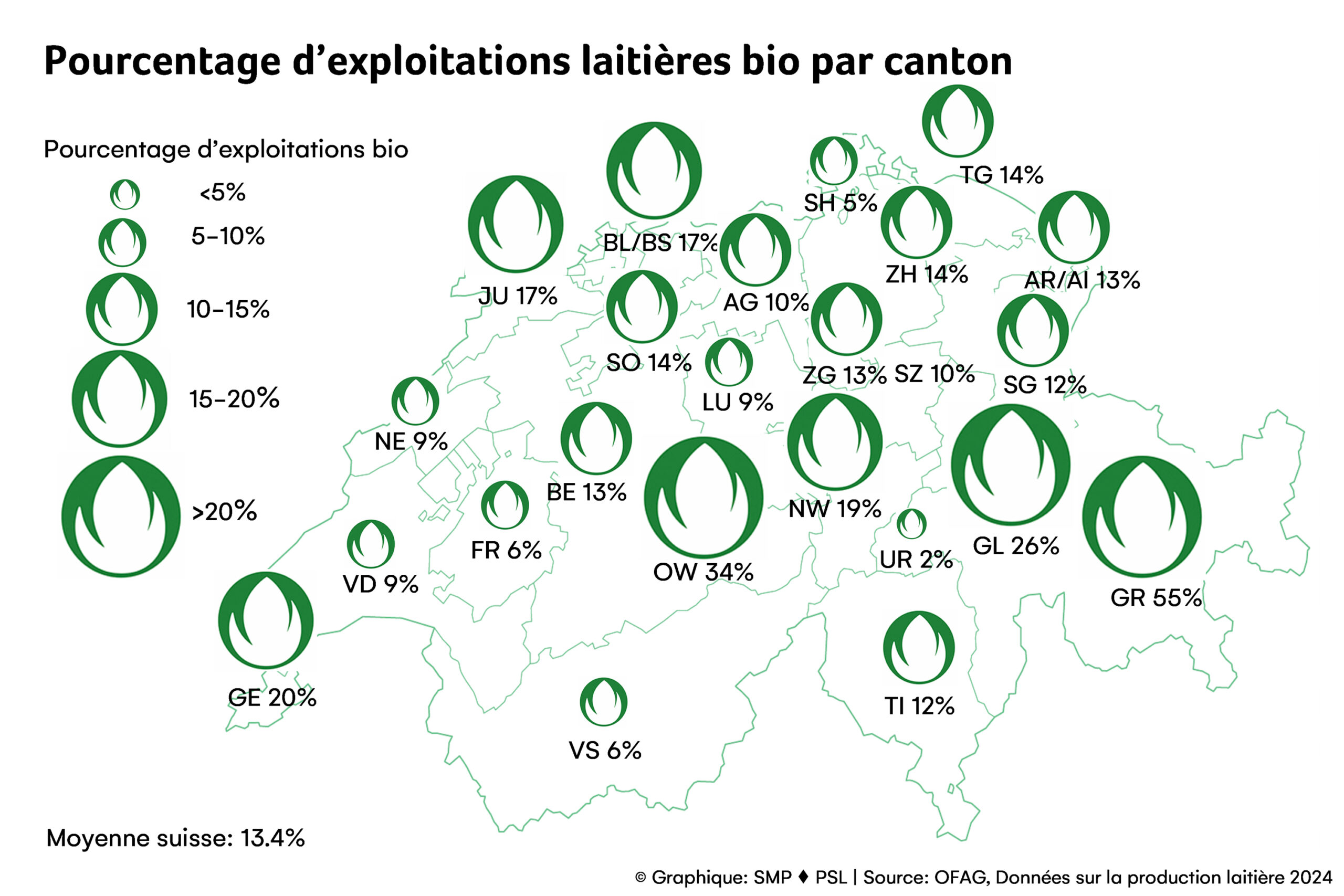 En Suisse, quelque 2237 exploitations laitières se conforment aux exigences de l'agriculture biologique, soit environ 13% de toutes les exploitations. Elles vendent aux transformateurs 280 millions de kilos de lait, ce qui représente environ 8% de l'offre. Le pourcentage d'exploitations bio varie fortement d'une région à l'autre.