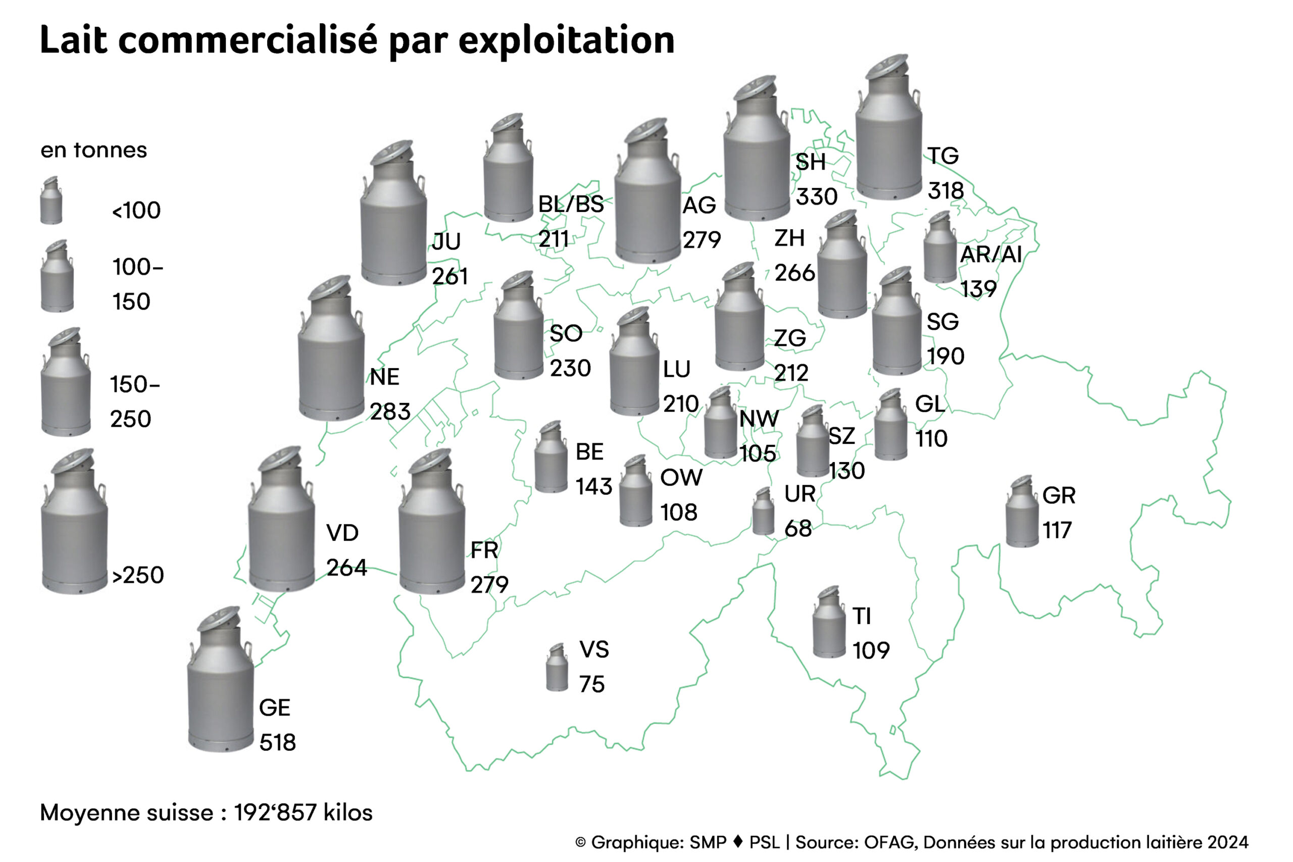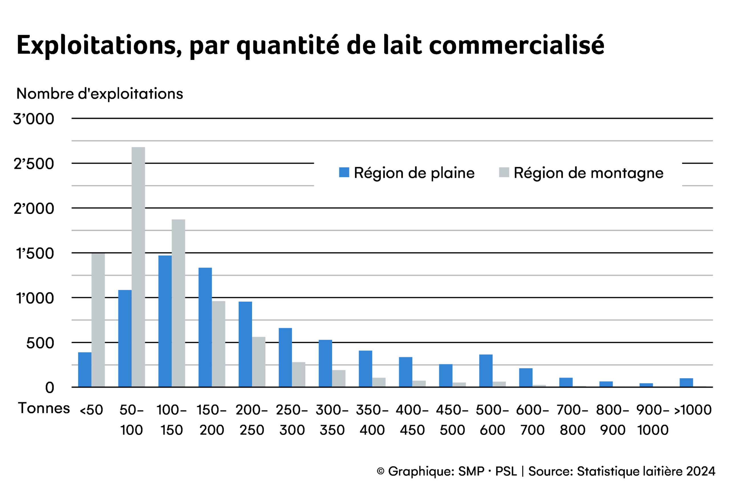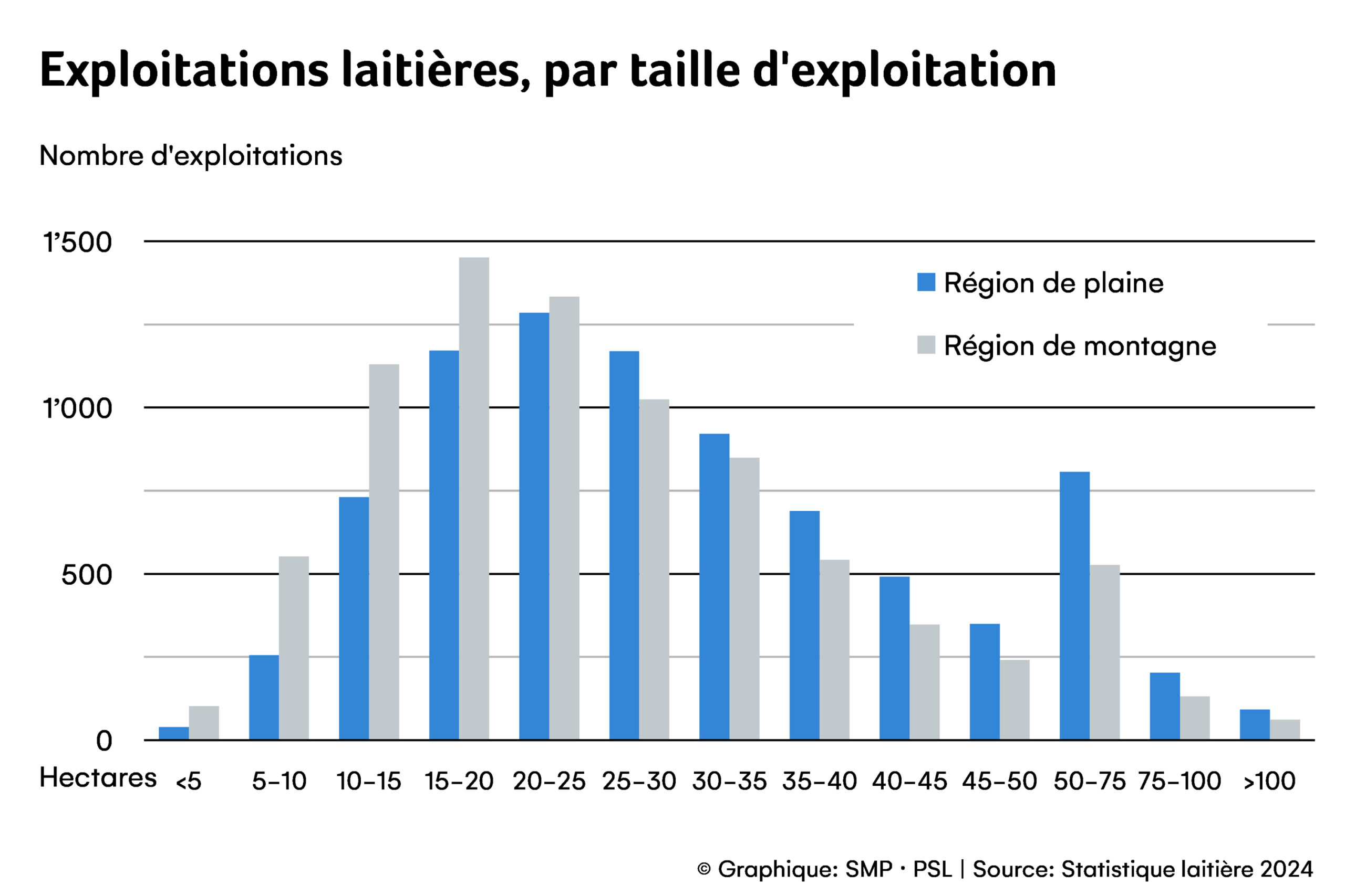 Environ 50% des producteurs de lait sont actifs en région de plaine, contre 50% en région de montagne. En région de plaine, un producteur exploite en moyenne 31,9 hectares de terres, détient 35,5 vaches et produit 257 000 kilos de lait par an. En région de montagne, ce sont en moyenne 27,6 hectares, 23,3 vaches laitières et 129 000 kilos de lait. Par ailleurs, pendant la saison d'estivage, une moyenne de 48 000 kilogrammes de lait est produite dans les quelque 1800 exploitations d'alpage.