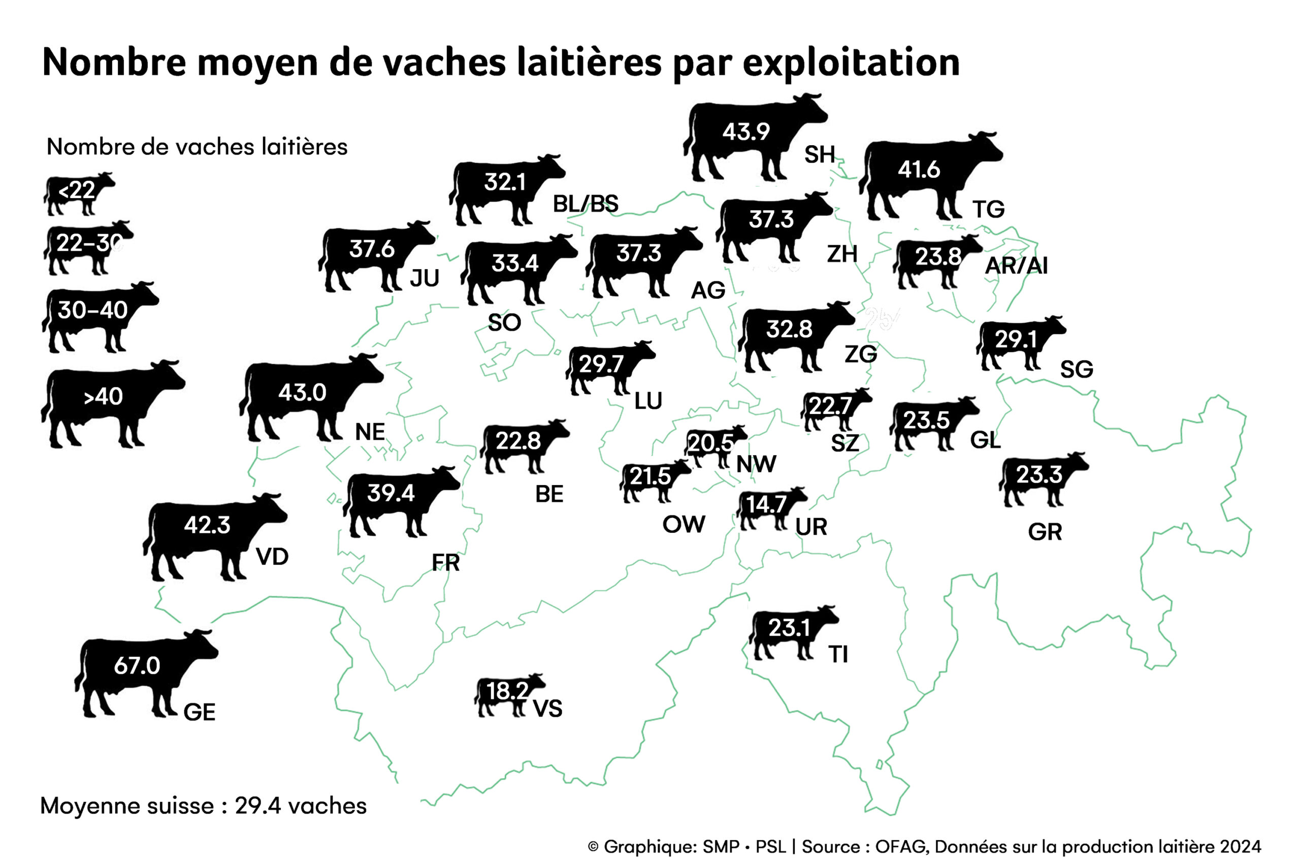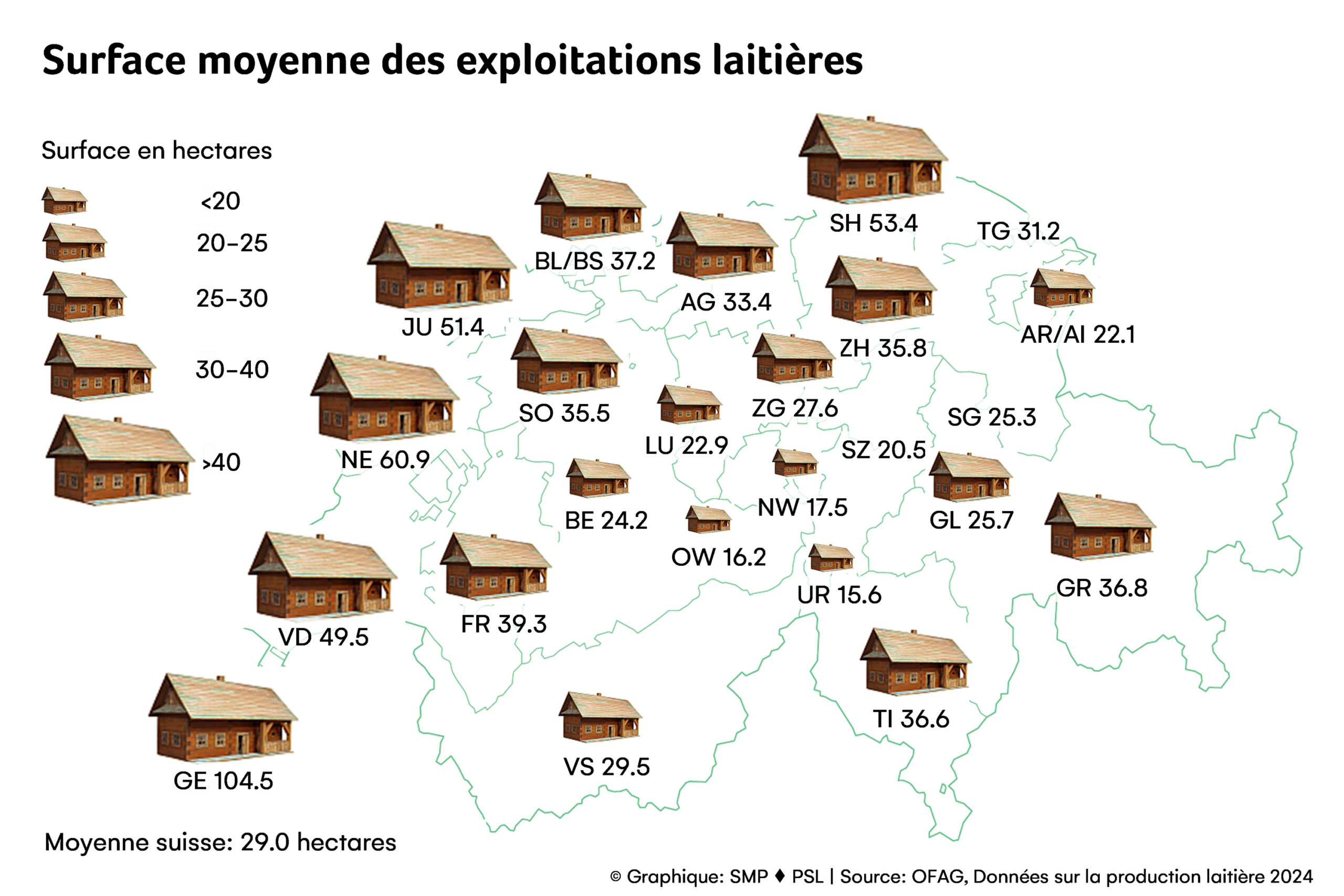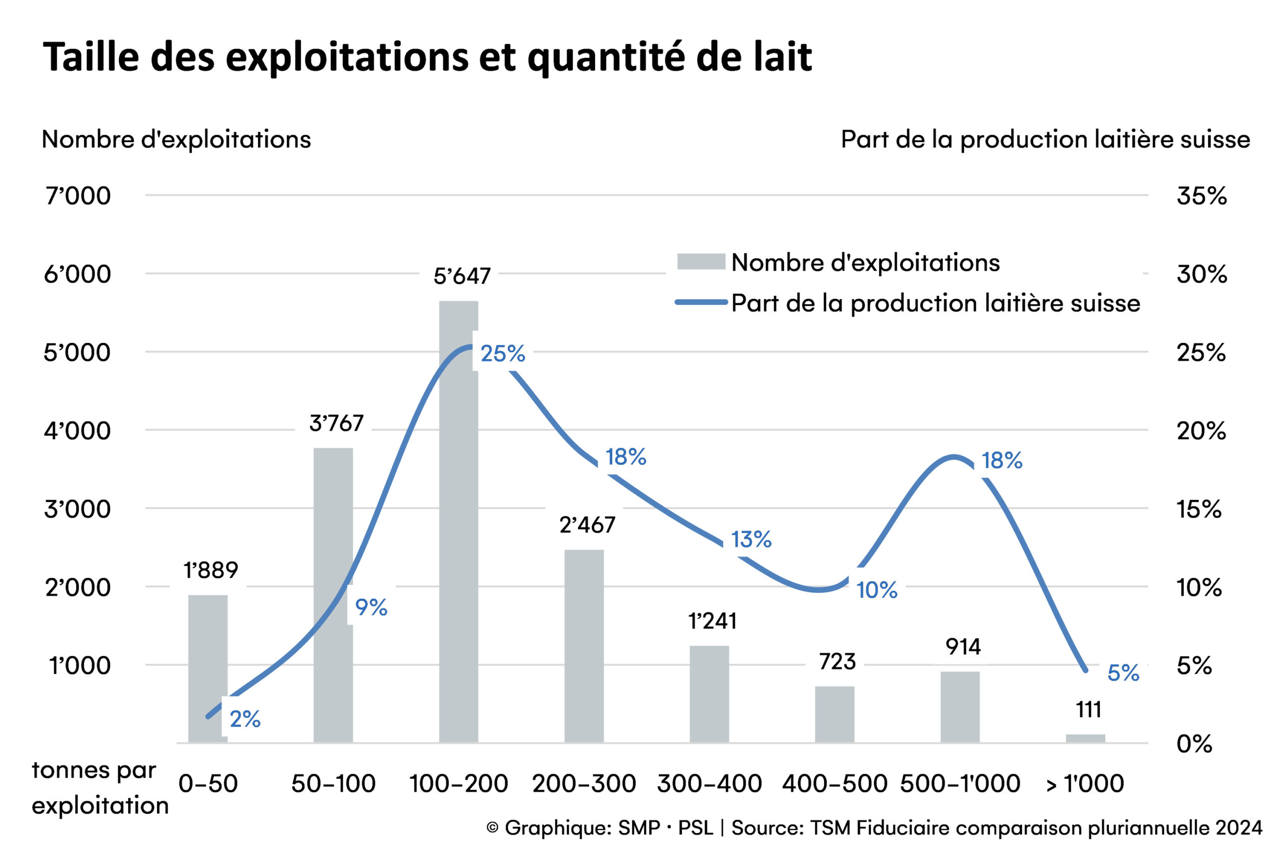 Environ 50% des producteurs de lait sont actifs en région de plaine, contre 50% en région de montagne. En région de plaine, un producteur exploite en moyenne 31,9 hectares de terres, détient 35,5 vaches et produit 257 000 kilos de lait par an. En région de montagne, ce sont en moyenne 27,6 hectares, 23,3 vaches laitières et 129 000 kilos de lait. Par ailleurs, pendant la saison d'estivage, une moyenne de 48 000 kilogrammes de lait est produite dans les quelque 1800 exploitations d'alpage.