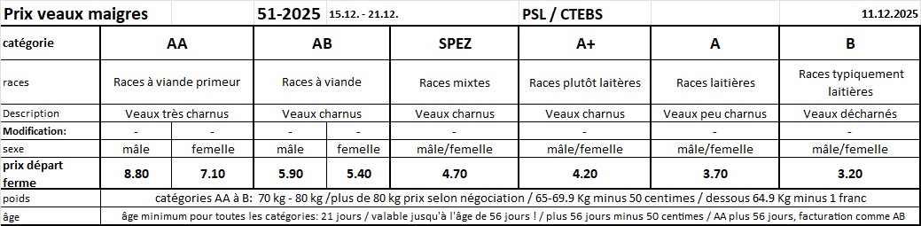 Des 2020 les exploitations de naissance – représentées par la Communauté de travail des éleveurs de bovins suisses (CTEBS) et la fédération des Producteurs Suisses de Lait (PSL) publient prix conseillé pour les veaux maigres. Les producteurs de lait doivent recevoir une indication aussi précise que possible du prix qui peut être obtenu pour un veau maigre.