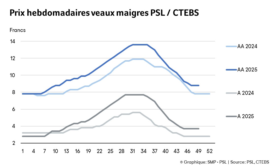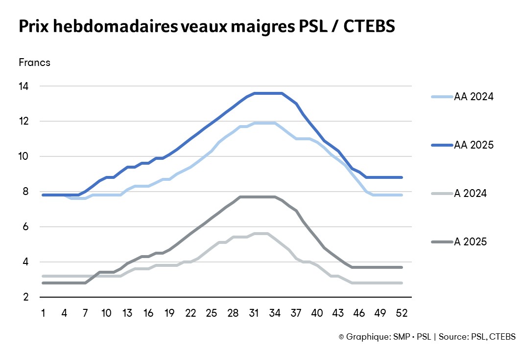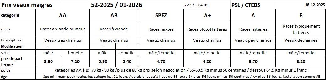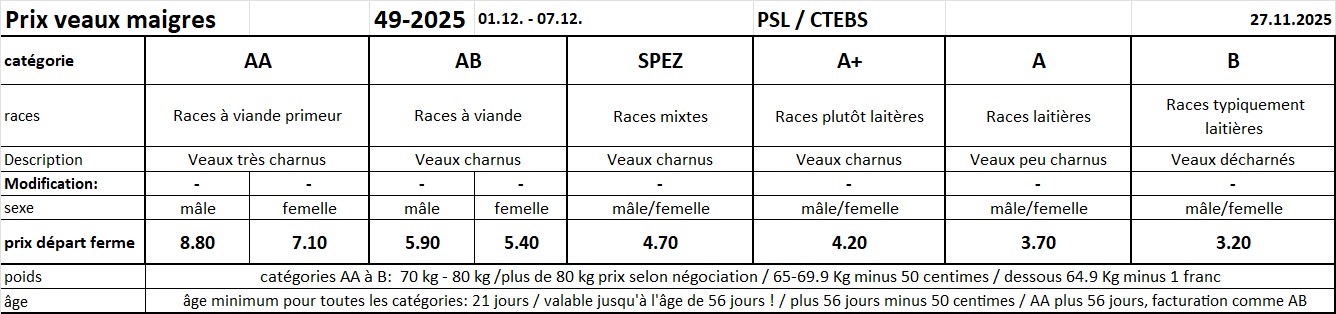 Des 2020 les exploitations de naissance – représentées par la Communauté de travail des éleveurs de bovins suisses (CTEBS) et la fédération des Producteurs Suisses de Lait (PSL) publient prix conseillé pour les veaux maigres. Les producteurs de lait doivent recevoir une indication aussi précise que possible du prix qui peut être obtenu pour un veau maigre.