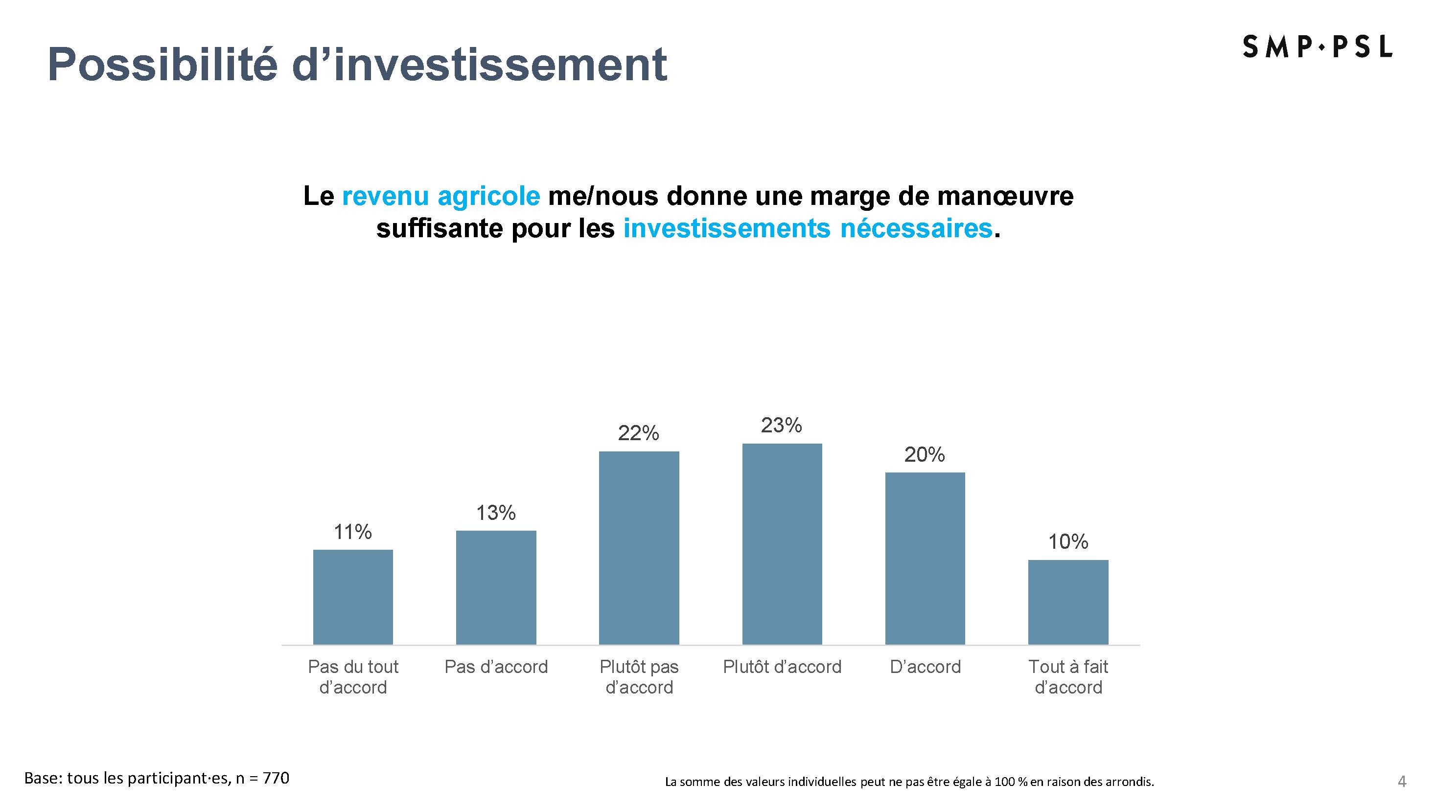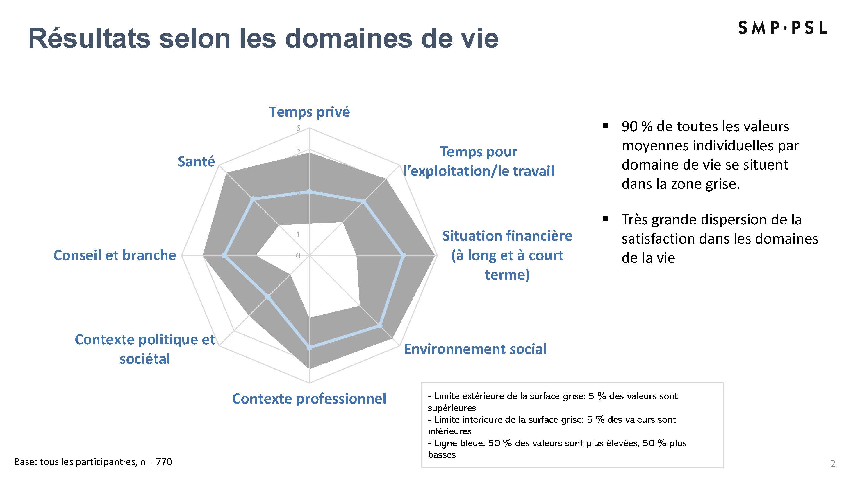 Dans le même temps, les résultats mettent en évidence certains points critiques: près de la moitié des personnes participantes jugent leur capacité d'investissement insuffisante, ce qui constitue un réel signal d'alarme. Environ 30 % d’entre elles seulement qualifient leur situation financière de bonne à très bonne. Il ressort également des résultats que le manque de vacances et les difficultés pour se faire remplacer ont un impact négatif sur la qualité de vie.