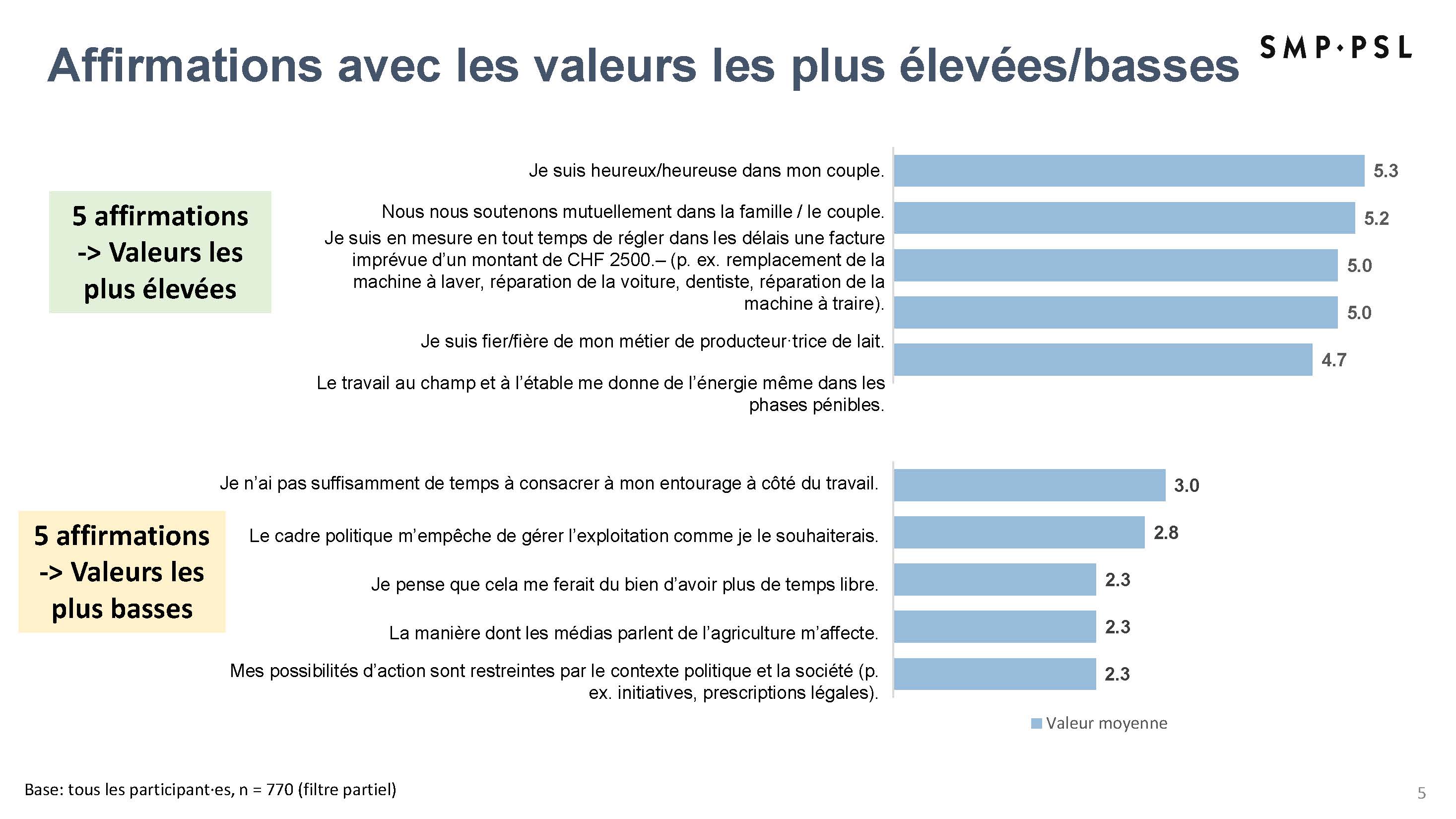 L'un des principaux enseignements de l'analyse des résultats est la fierté marquée des producteurs·trices de lait pour leur métier: la grande majorité des participant·es à l'autoévaluation considèrent que celui-ci a du sens. Autre effet positif sur le bien-être: la cohésion familiale. Les producteurs·trices jeunes et bien formés en particulier font preuve d’une motivation supérieure à la moyenne pour développer leur exploitation et augmenter leur production laitière. Cette volonté d'innover et de se tourner vers l'avenir est particulièrement visible dans les grandes exploitations, qui misent davantage sur la croissance et le développement.