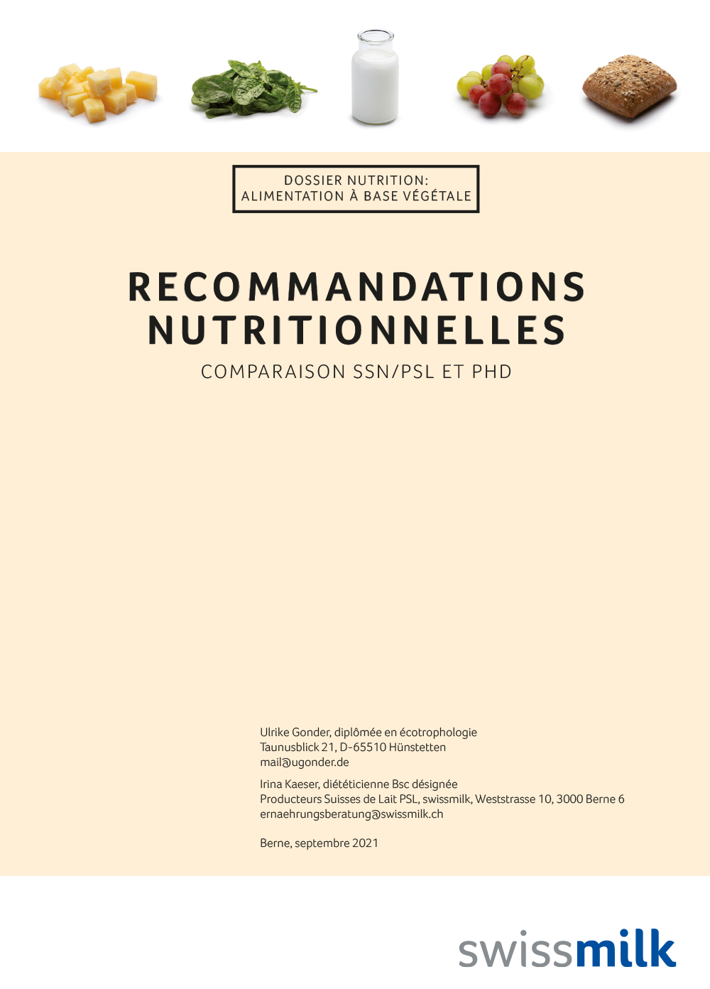 Ce dossier compare au niveau nutritionnel un plan journalier conçu selon les recommandations de la Producteurs Suisses de Lait PSL avec les normes de la Plane¬tary Health Diet (PHD). Le plan journalier PHD est calculé une fois avec 250 ml de lait/produits laitiers, et une fois sans lait.