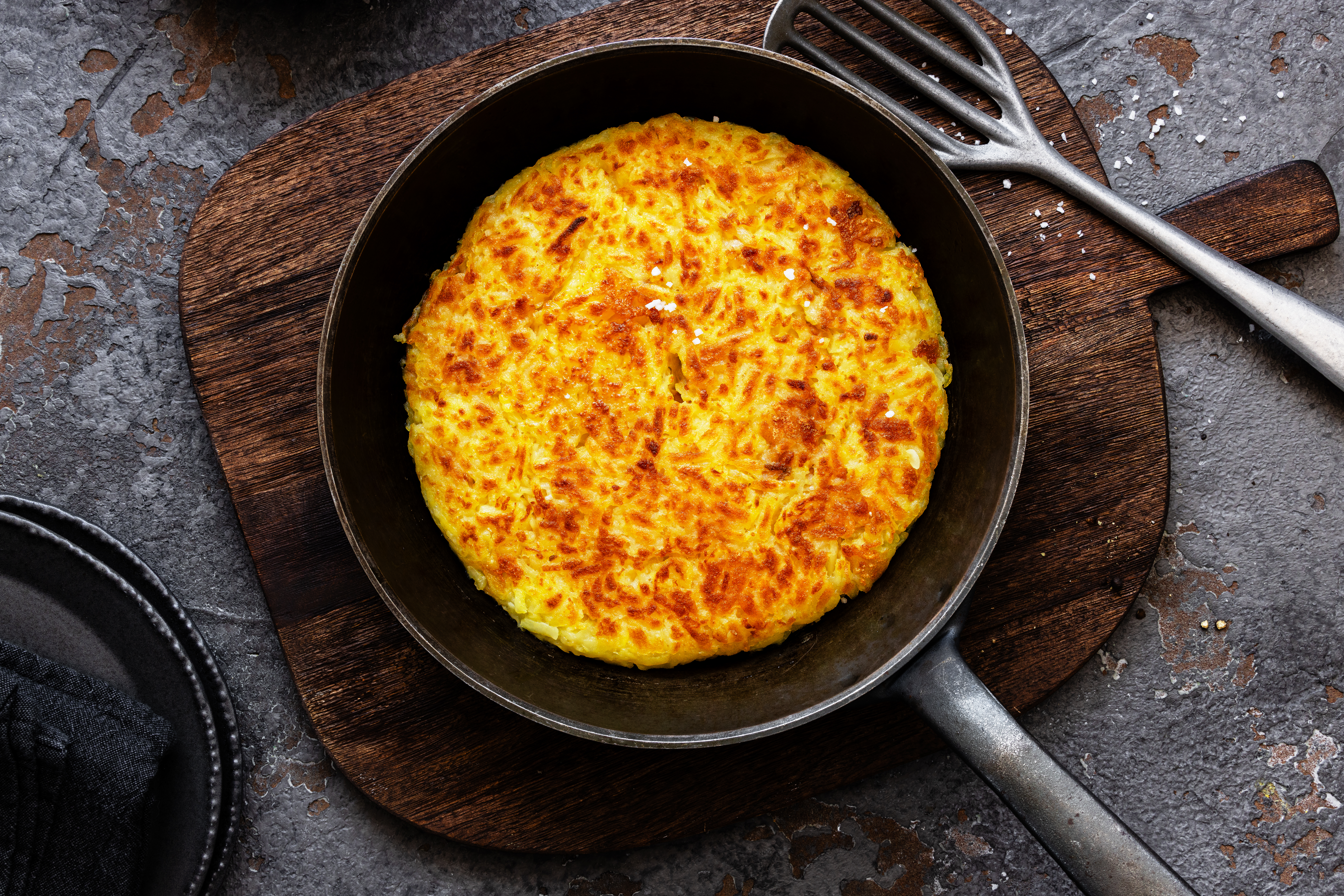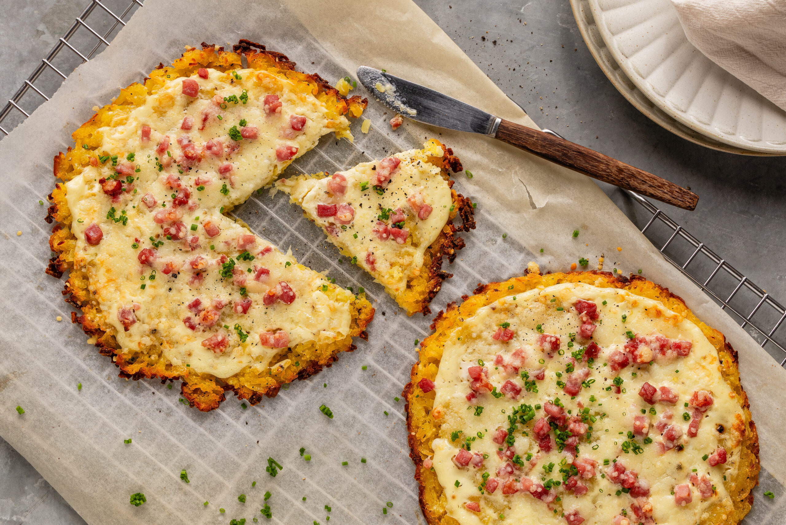 4. Glisser les rösti sur une assiette chaude, décorer.