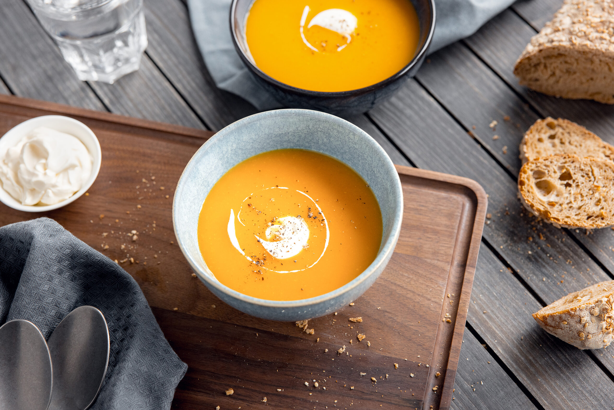 Unanimité au sein de l'équipe de rédaction (et ce n'est pas parce qu'on travaille pour Swissmilk ?): les produits laitiers apportent LA touche finale à toute soupe de légumes. Pour le goût, pour équilibrer l'acidité, et pour la belle consistance crémeuse. Vous pouvez mettre de la crème, du fromage frais ou autre dans votre soupe au moment de la cuire, ou ajouter une cuillerée de crème acidulée ou de cottage cheese tout à la fin. Choisissez aussi le produit laitier en fonction de vos envies: plutôt soupe aux légumes riche et rassasiante, ou portion de protéine supplémentaire?